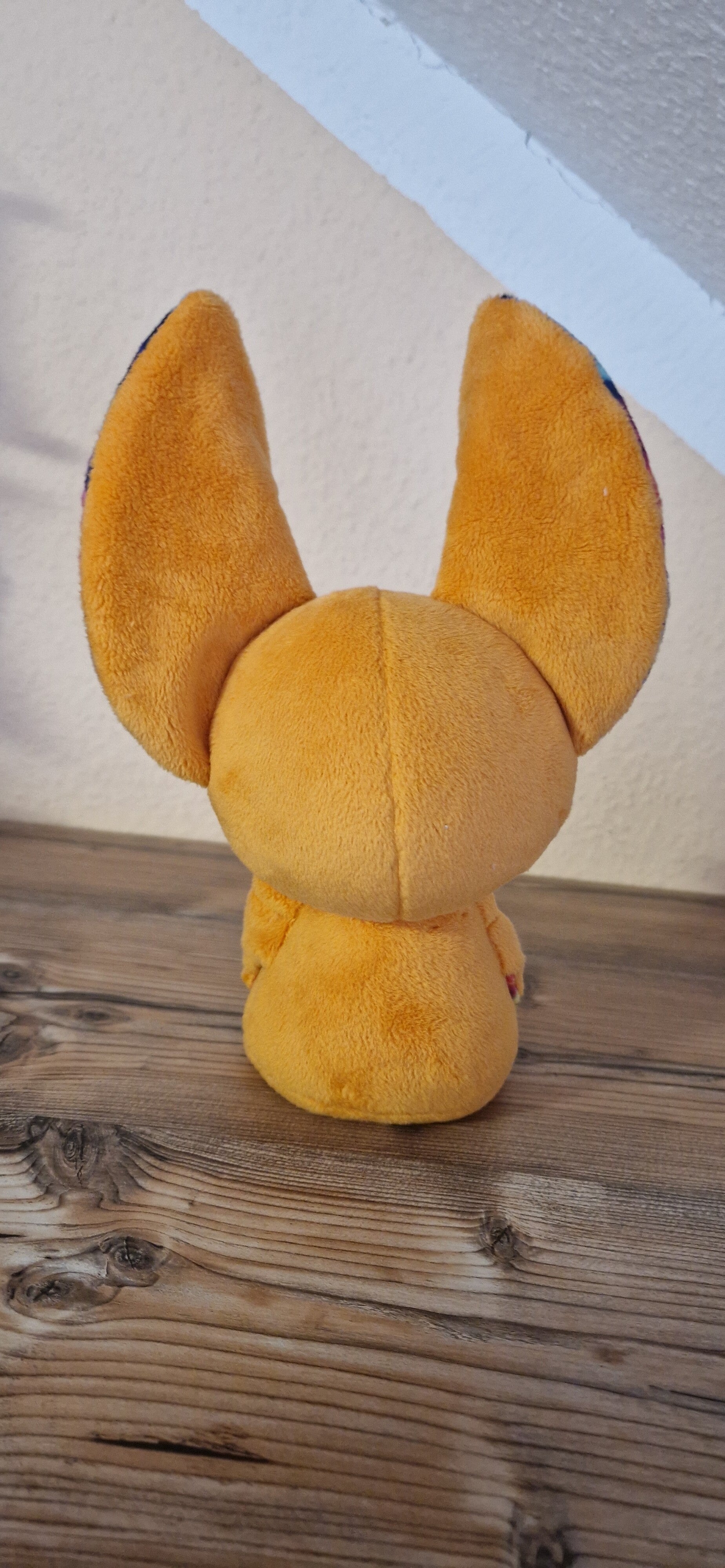 Die Plüschies sind aus Minky genäht. Die Augen sind mit Glowy Garn gestickt. Dieses lichtaktive Garn leuchtet im Dunkeln! KEINE Magneten in den Flügeln.